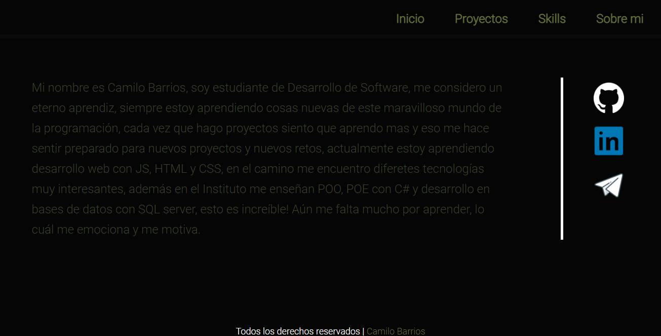 Mi nombre es Camilo Barrios, soy estudiante de Desarrollo de Software, me considero un eterno aprendiz, siempre estoy aprendiendo cosas nuevas de este maravilloso mundo de la programación, cada vez que hago proyectos siento que aprendo mas y eso me hace sentir preparado para nuevos retos, en el camino me encuentro diferentes tecnologías muy interesantes, esto es increíble! Aún me falta mucho por aprender, lo cuál me emociona y me motiva.